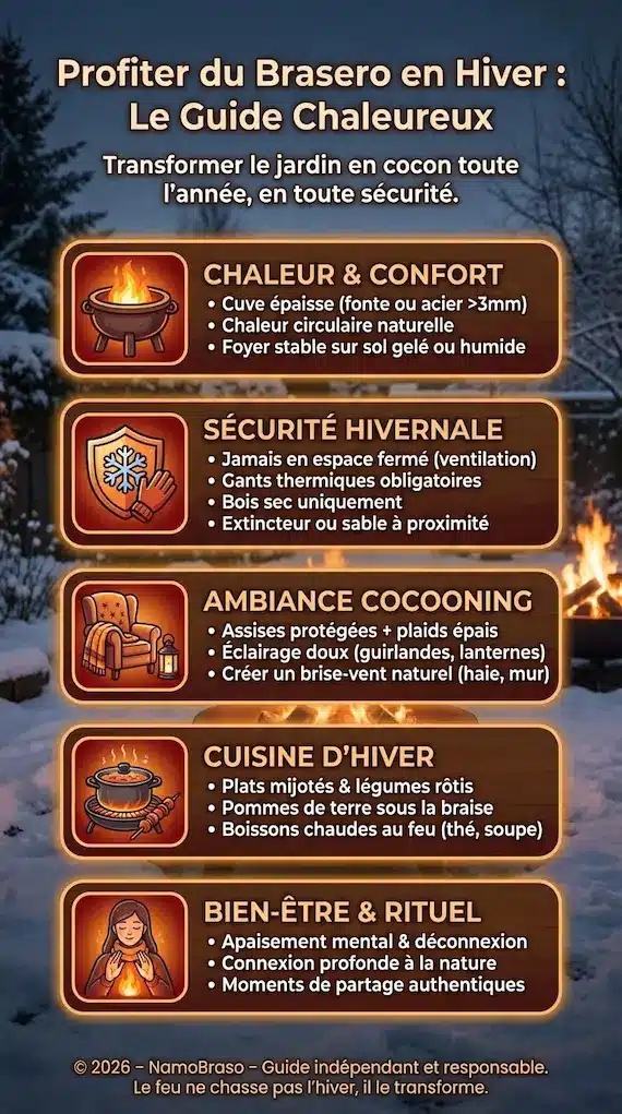 Avec un brasero bien utilisé, ton jardin peut devenir un véritable cocon hivernal : chaleureux, convivial et vivant, même par grand froid.
